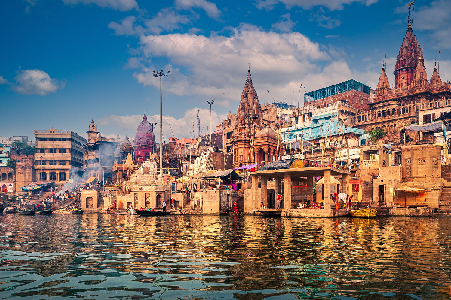 Nestled on the banks of the sacred River Ganges, Varanasi's ancient architecture, winding alleys, and bustling ghats create a captivating and ethereal atmosphere. The vibrant colors of its temples and the scent of incense permeating the air add to its mystical allure.
